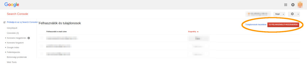 - A nyitóoldalon keressük meg azt a domaint, amelyikhez tartozó Search Console fiókot meg akarjuk osztani.